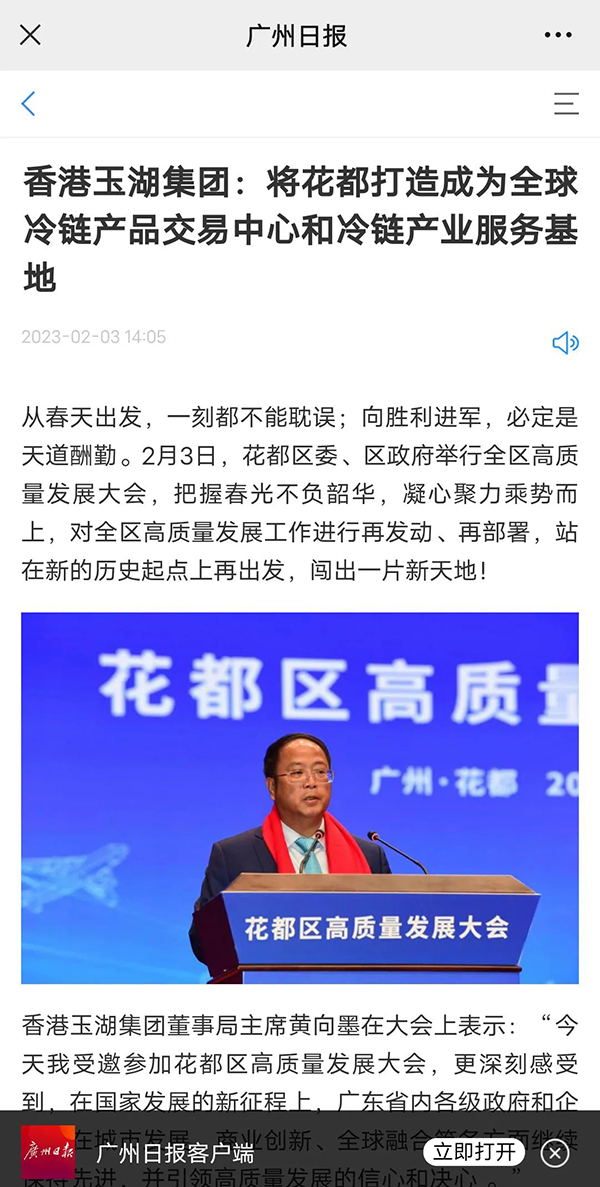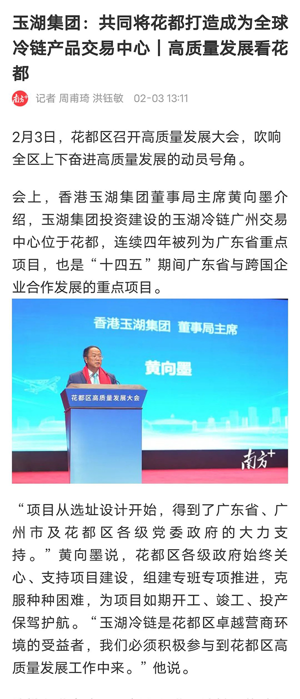 廣州日報也對黃向墨的發言進行了報道。根據報道,冷鏈⾏業在中國是新興⾏業,冷鏈設施建設作為中國保障⻝品安全和⻝品供應鏈的關鍵環節,是當前中國「新基建」的重要基礎領域。為了建設⼀個與國際接軌,集交易、加⼯、倉儲、91视频免费下载观看於⼀體的⼀站式冷鏈綜合園區,⽟湖集團投資近50億元打造⽟湖冷鏈(⼴州)交易中⼼ 。